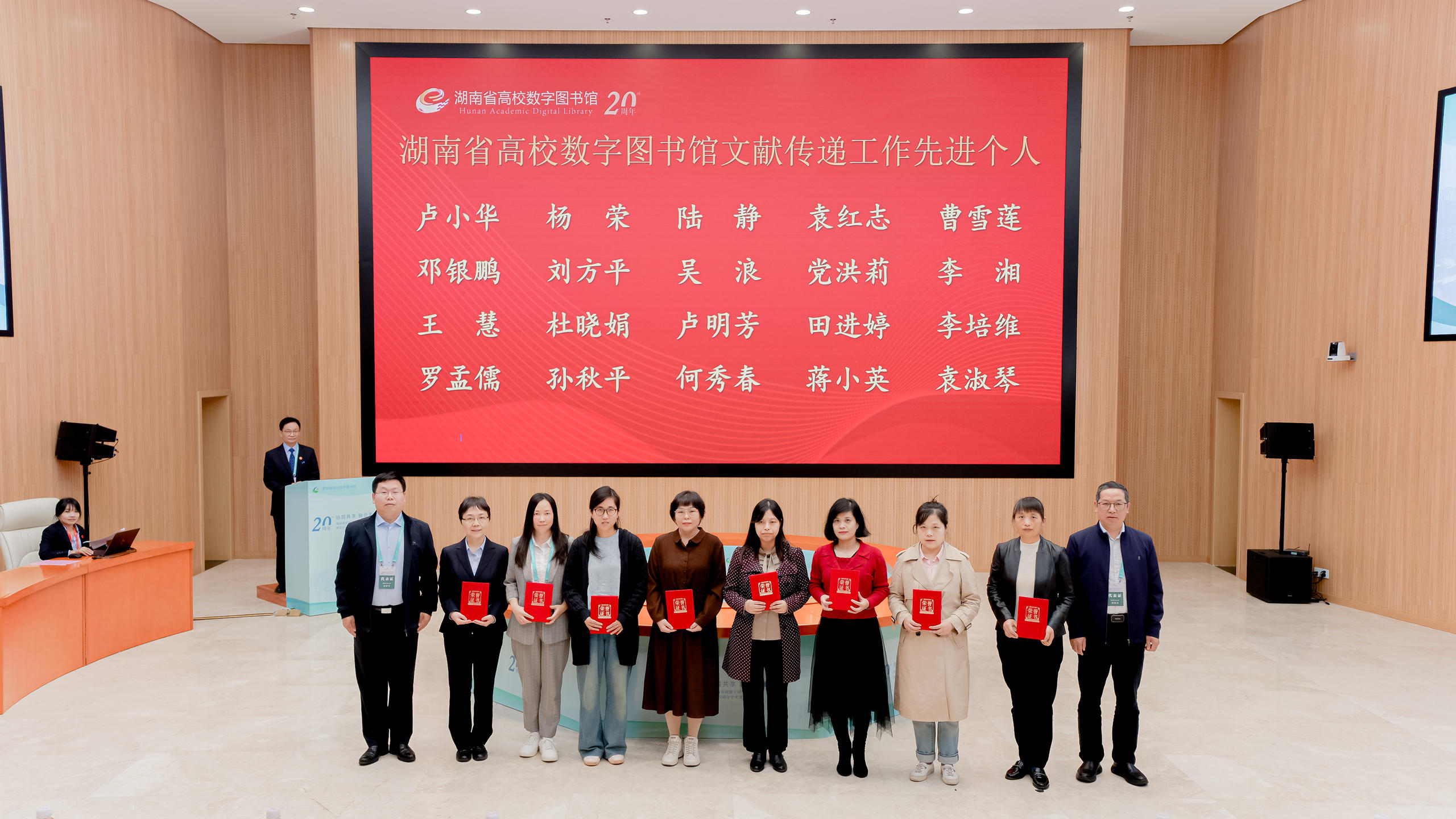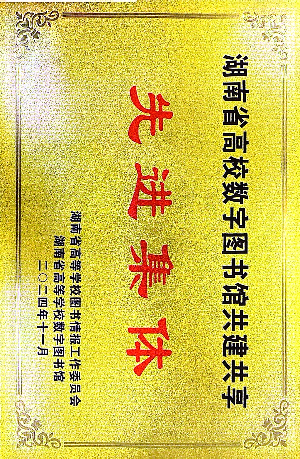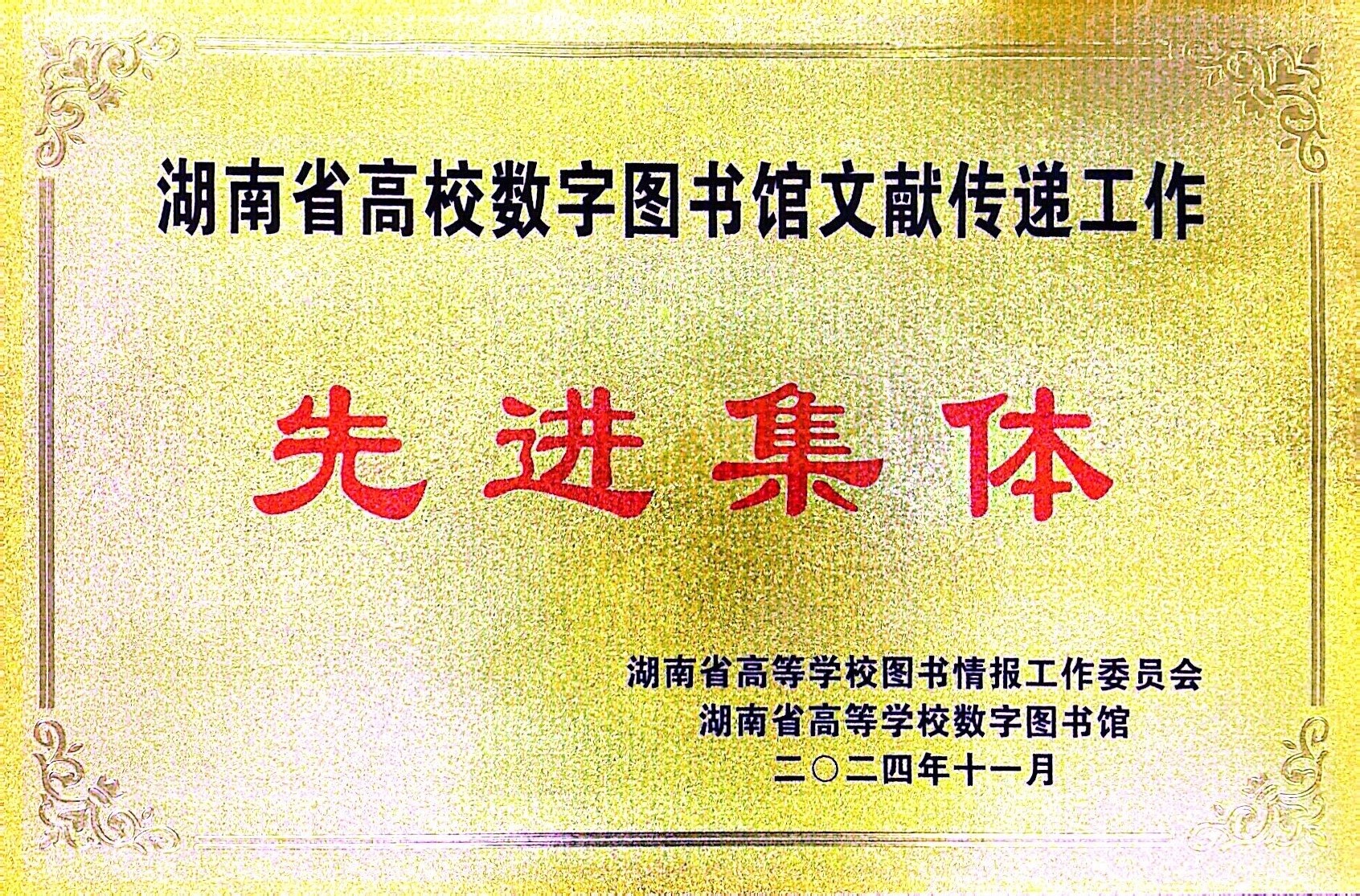 2024年11月12日,由湖南省高等学校图书情报工作委员会主办,湖南师范大学图书馆承办的湖南省高校数字图书馆建设20周年学术交流会在湖南师范大学图书馆顺利召开,我校图书馆馆长张立强以及来自全省高数图成员馆的150余人参加了会议。我校图书馆获得了“湖南省高校数字图书馆共建共享先进集体”和“湖南省高校数字图书馆文献传递工作先进集体”荣誉称号。